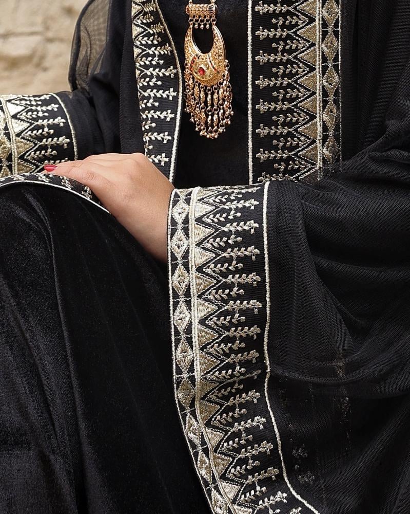 المزيدمكونات الباكج والتفاصيل:الفستان عبارة عن قطعتين .مستلهم من التراث النجدي:فستان أسود استرتش، باكمام طويله و قصة كلوش .مشلح نجدي مطرّز بتطريز خاص فخم.تع...