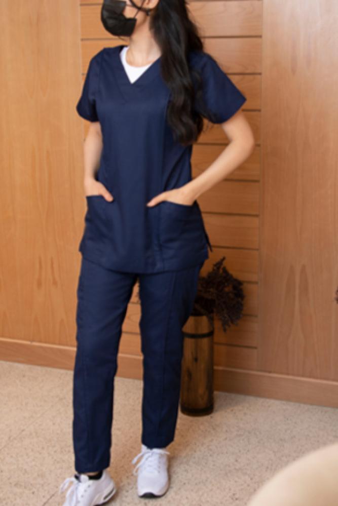 •(سكراب باللون الكحلي - Blue scrub ) •التفاصيل: خام مميز ناعم عمليسكراب بأكمام قصيرة، يحتوي على ثلاث جيوبوياقة على شكل V بقصة مميزة.المواصفا...