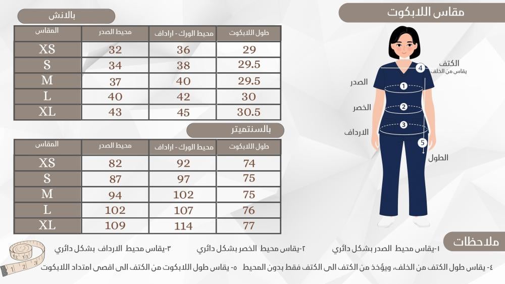 التفاصيل:سكراب باللون الابيض، الخام بوليستر مرن .مع وجود 3 ازراير من الأمام .وياقة من الامام.جدول مقاسات اللابكوت:مقاس المودل: xsطول المودل: 154...